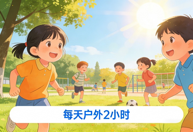 保证户外时间:每天日间户外活动不少于2小时,如散步、打球等。自然光线有助于延缓眼轴增长,阴天同样有效。
